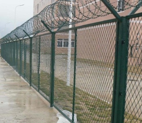 監(jiān)獄巡邏道隔離網(wǎng)整體設(shè)計高大、美觀、實(shí)用,網(wǎng)墻的設(shè)計具剪切、防攀爬功能,能夠十分有效的防止罪犯的潛逃。監(jiān)獄巡邏道鋼網(wǎng)墻V型架頂端安裝刀片刺網(wǎng),直徑采用50cm-60cm刀片刺網(wǎng)主要是由熱鍍鋅鋼板或不銹鋼薄板沖壓而成的,它擁有尖銳的刀片,高張力鍍鋅鋼絲或者不銹鋼絲做芯線組合而成的產(chǎn)品。